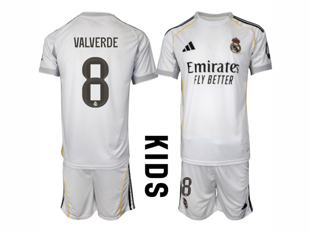 Real Madrid CF 2025/26 Home Youth White Soccer Jersey with #8 Valverde Printing