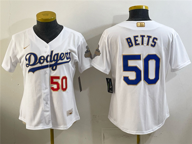 > Los Angeles Dodgers #50 Mookie Betts Women's White 2026 Gold Collection Jersey
