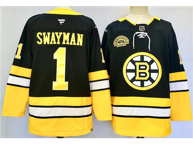 > Boston Bruins #1 Jeremy Swayman Black Alternate 100th Anniversary Jersey